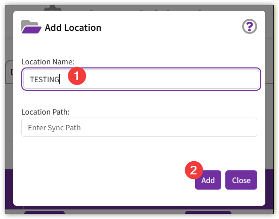 - In the Location Name field enter TESTING. Leave the Location Path field blank and pick Add