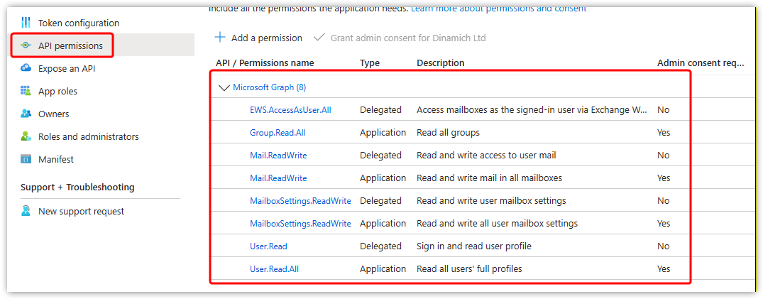 So follow this link which takes you to the page where new customers grant CloudFiler permission to access Exchange On-line, and update your settings: Give CloudFiler permission to connect to Exchange Online As mentioned above, you do not need to send us the 3 ID numbers, you only need to add the required permissions. |