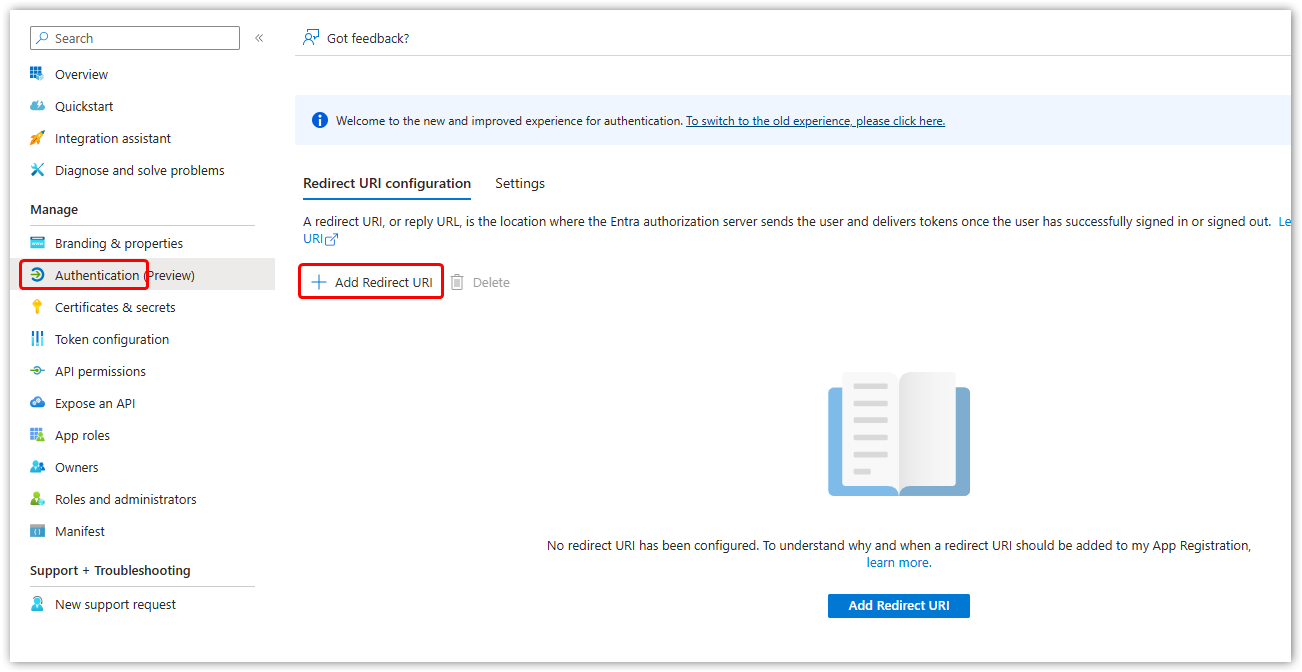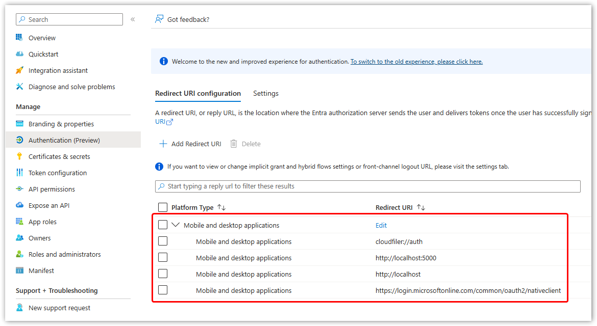 Integrated Authentication SetupYou now need to provide access so that CloudFiler's Hub can manage user authentication. The steps are very similar, so once again take your time and follow them carefully. Pick Authentication and then Add Redirect URI