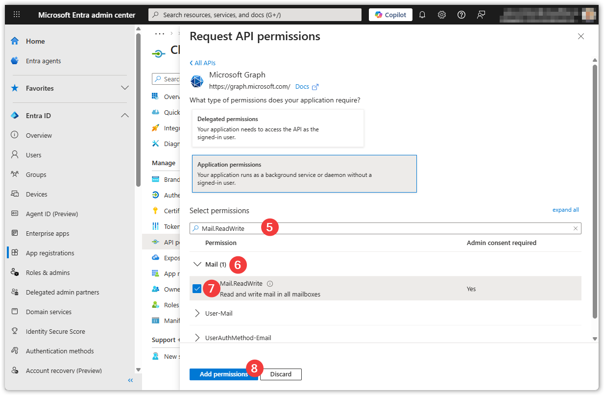 You will see that there are two types of permissions: Delegated and Application. We need to assign both and will start with the Application permissions. Our aim is to first assign the following Application permissions: Mail.ReadWrite Group.Read.All MailboxSettings.ReadWrite User.Read.All We will do the Mail.ReadWrite first, so select Application permissions