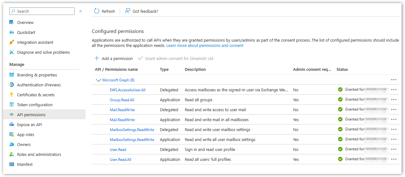 Adding Delegated permissionsWhereas were were adding Application permissions in the previous steps, we now need to add Delegated permissions. The step are nearly identical: API Permissions | Add a permission | Microsoft Graph | Delegated Permissions | then the required permission So now add the following Delegated Permissions: EWS.AccessAsUser.All Mail.ReadWrite MailboxSettings.ReadWrite User.Read If you now select API permissions on the left, your permissions should look like this: