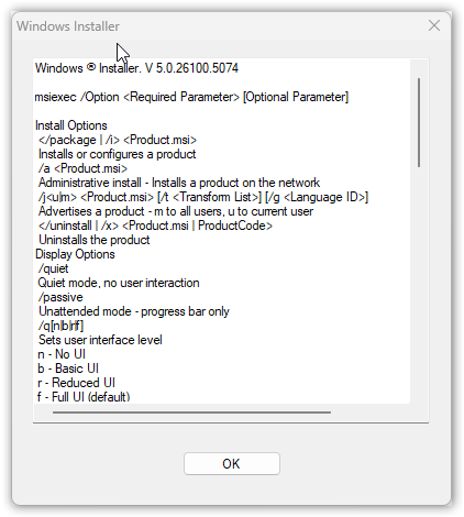 NOTE: if the MSI filename includes spaces and thus needs to be enclosed in quotes as is the case in these examples, be sure to use straight quote characters and not angled quotes otherwise you will get this error: