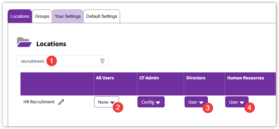 So click on the Locations tab and type recruitment in the filter box to filter down to our HR Recruitment location.