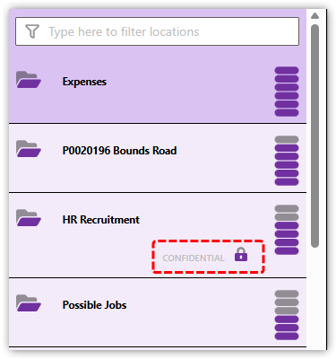 The changes are immediate, so if you now refresh the CloudFiler Add-in in Outlook, you will find that regular users won't be able to find the HR Recruitment location and the Directors and Human Resources team will see it, both when filing and searching, but they will also find that it's been marked as confidential so that they can see that the location is special and is only visible to a select few.