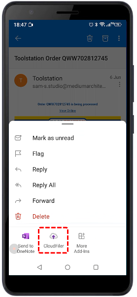 Download Microsoft Outlook onto your mobile phone and add your business email account to it - CloudFiler won’t work with the native email App on your phone, as Apple and Google don’t provide a way for developers to add features to their Apps.