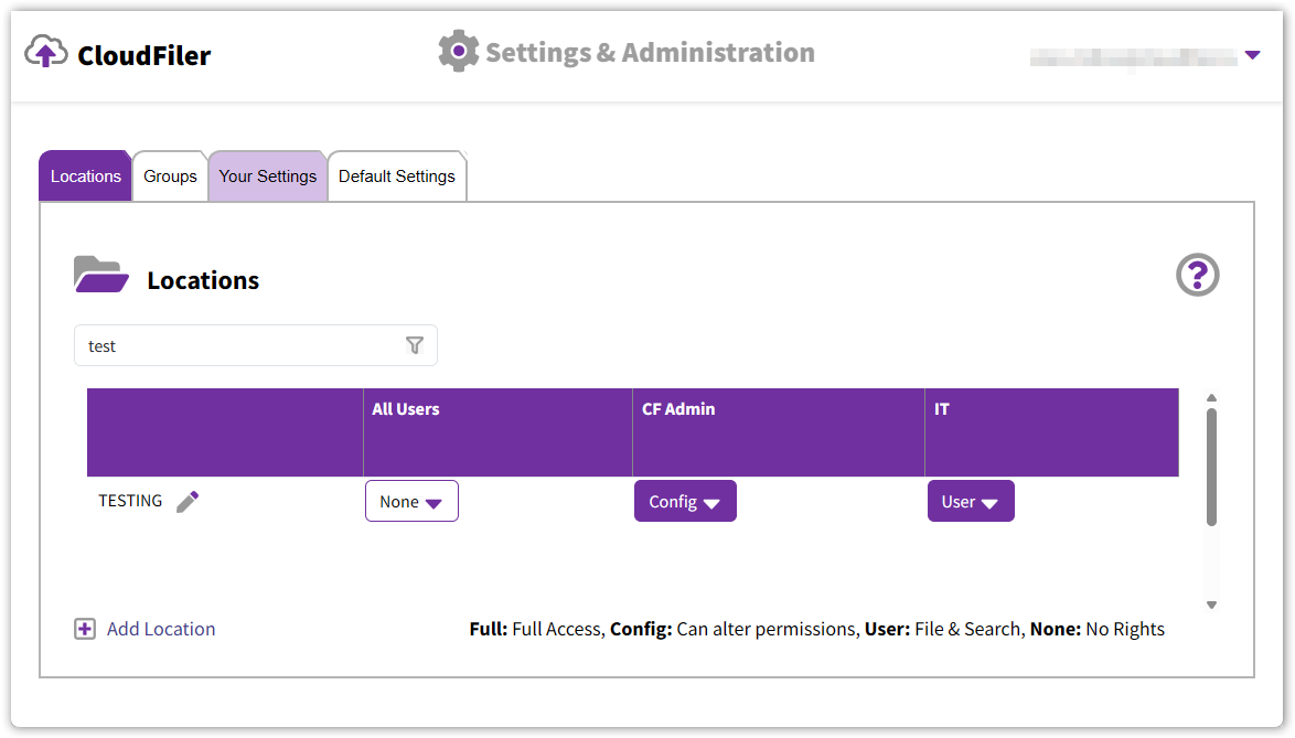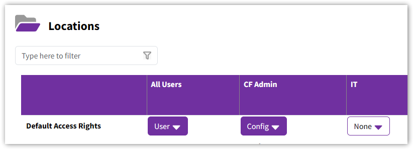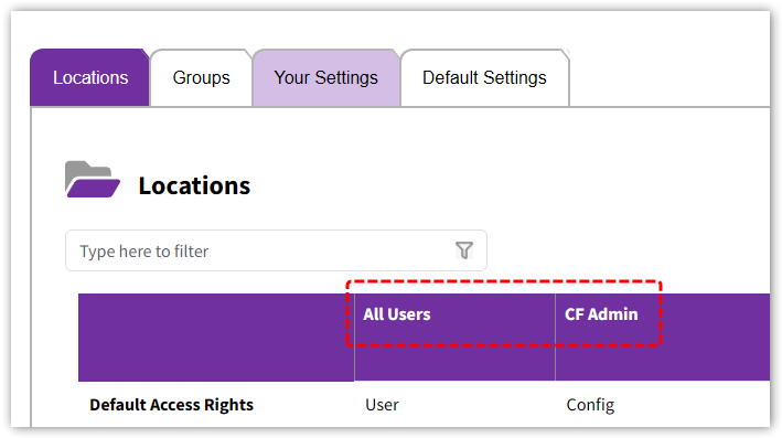 - Note that there are three columns. The first lists the locations. The other two are groups of people. All Users is automatically populated with all your staff. It provides an easy way to either grant or deny access to everyone. CF Admin stands for CloudFiler Administrators – if you have staff who are not Admins but you would like them to be able to edit locations, you can add them to this group